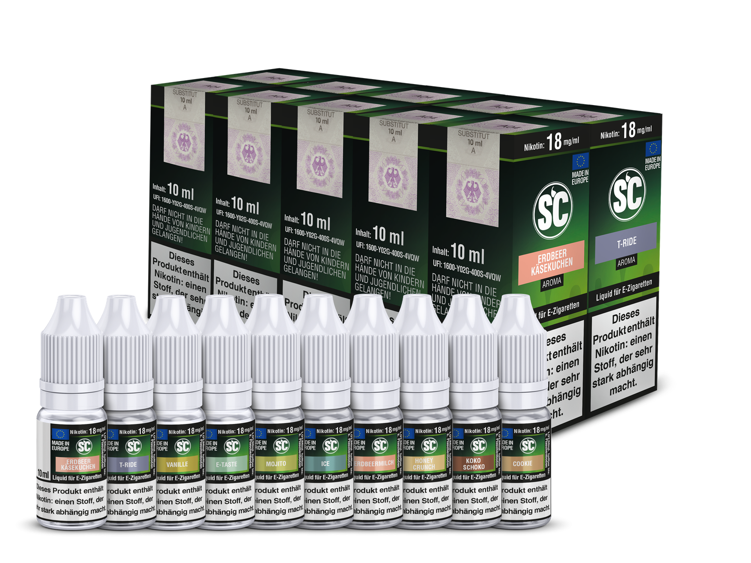 - 10× 10 ml Flaschen SC E-Liquid in verschiedenen Sorten