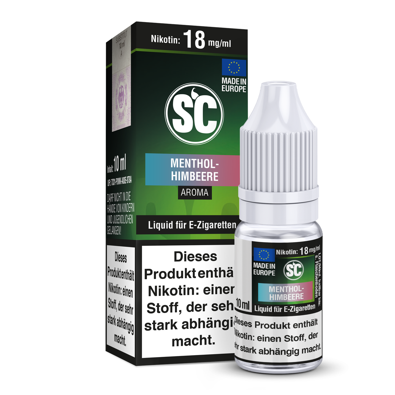 - 1× 10 ml Flasche SC Menthol-Himbeere E-Liquid in gewählter Stärke